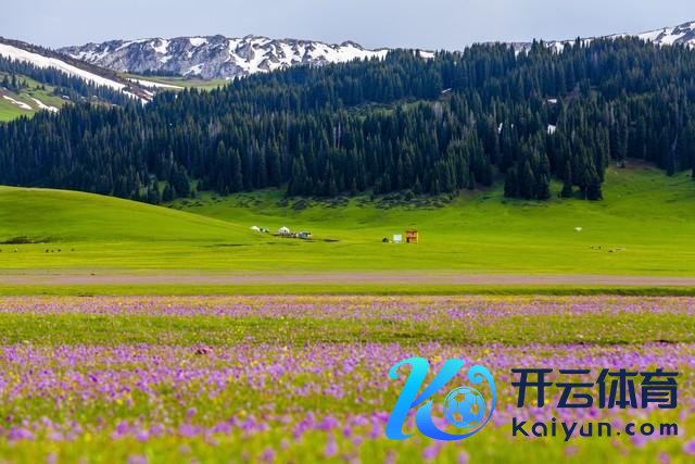 位于天山本地的那拉提,意为“起始见到太阳的场合”。这里既有群山的飘渺,又有河谷的纯粹,交汇出一幅立体的画卷。每年六月,野花遍开,将草甸点缀成五彩的织锦。迢遥雪山皑皑,近处牧马东说念主扬鞭,哈萨克族的毡房腾飞褭褭炊烟,组成了一幅宁静而悠远的游牧生涯图景,是“空中草原”最灵活的注解。