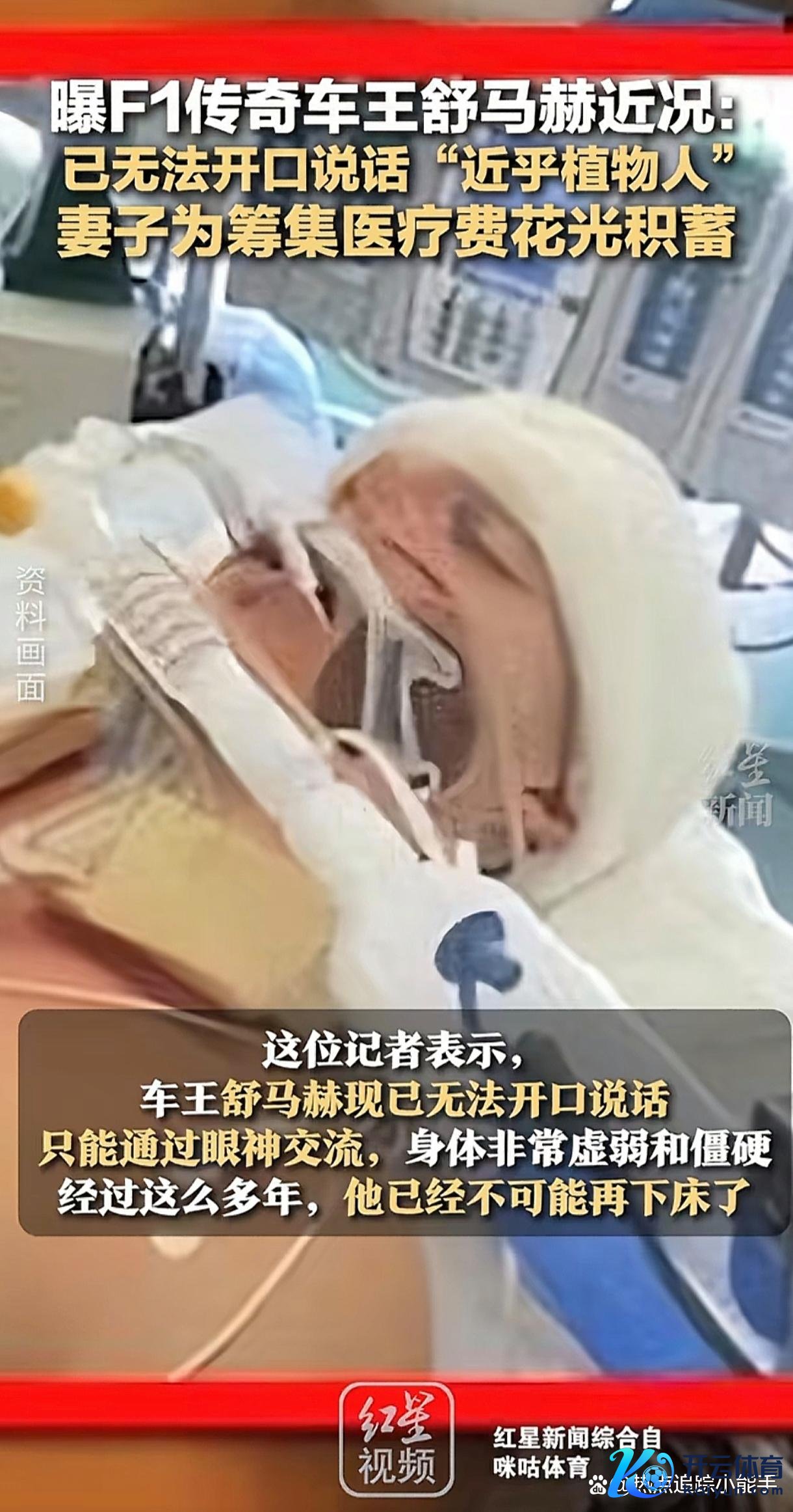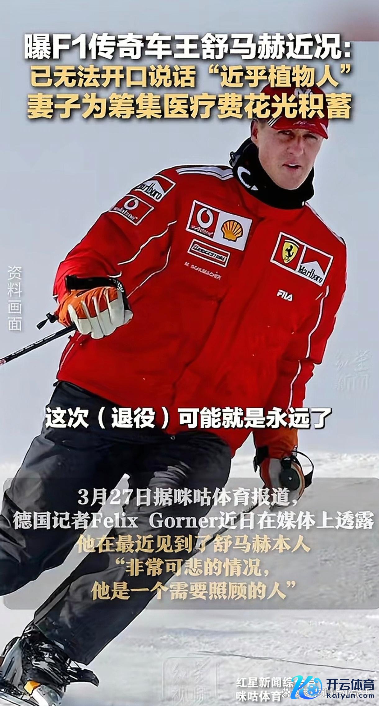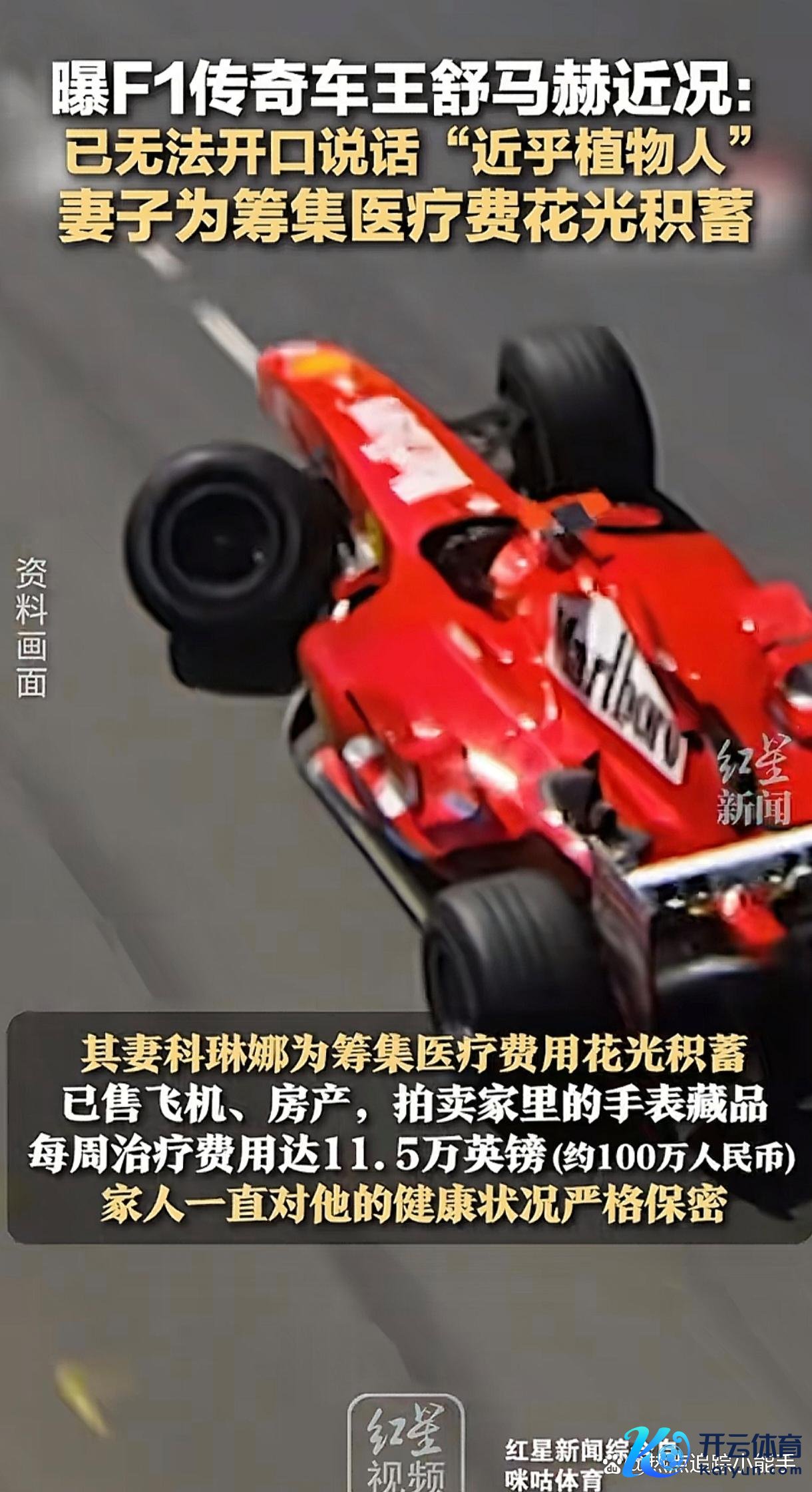 2013年12月29日,法国阿尔卑斯山滑雪场,舒马赫以200公里/小时的速率撞上岩石。头盔碎成两半,颅脑遇到烧毁性损害。大夫曾预言他“70%可能成为植物东谈主”,而爱妻科琳娜散尽家财、变卖飞机房产,以致典质婚戒为他续命。