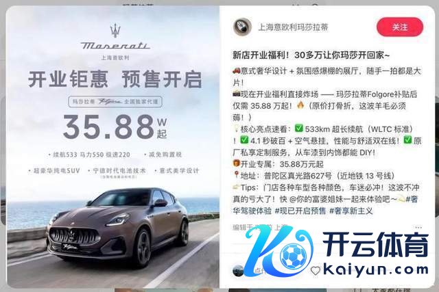 近日,一则对于玛莎拉蒂Grecale Folgore裸车起售价降至35.88万元的音信,在汽车圈激励了巨震。这个价钱相较于其高达89.88万元的官方指令价,降幅跨越了54万元,而这场源自经销商清库存的“跳水价”促销,竟不测地掀翻了一波抢购潮,上海等地门店甚而出现了主顾列队的表象。不外在已而诬害热心背后却是以玛莎拉蒂为代表的外资豪华汽车品牌,在中国市集面靠近的集体性窘境,接下来咱们就来深度分析一下这件事情背后的变局。