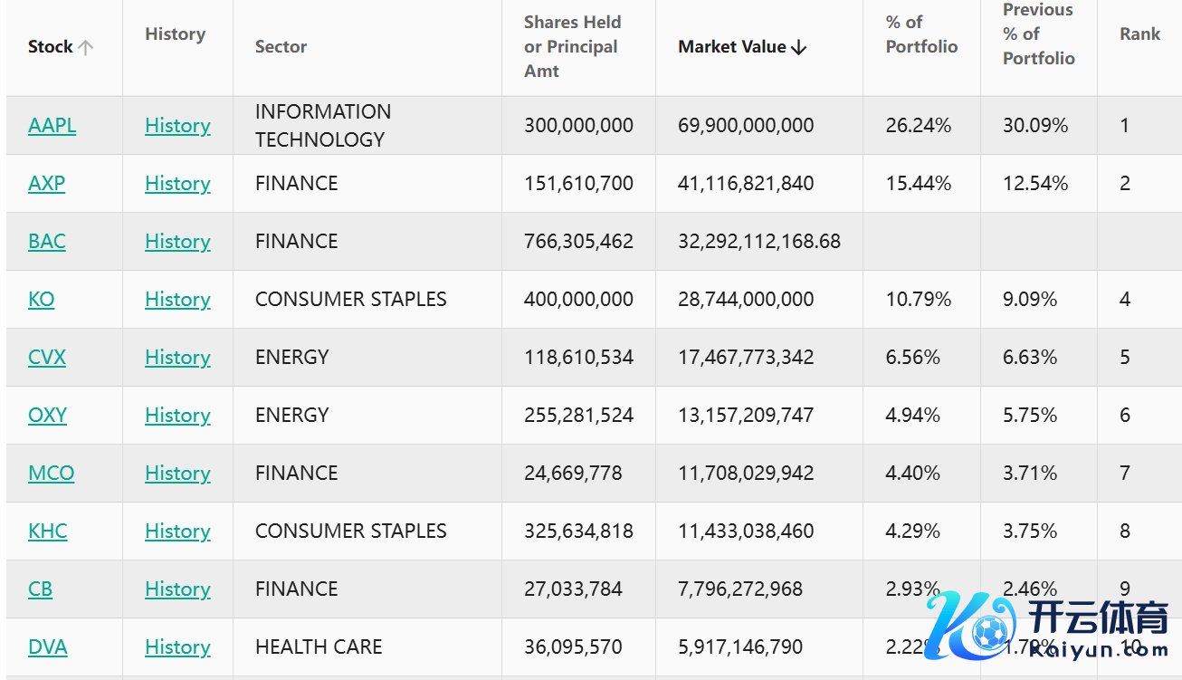 伯克希尔的前十大捏仓方针占总市值的89.68%,永诀是苹果、好意思国运通、好意思国银行、好意思味可乐、雪佛龙、西方石油、穆迪、卡夫亨氏、丘博保障和德维特。