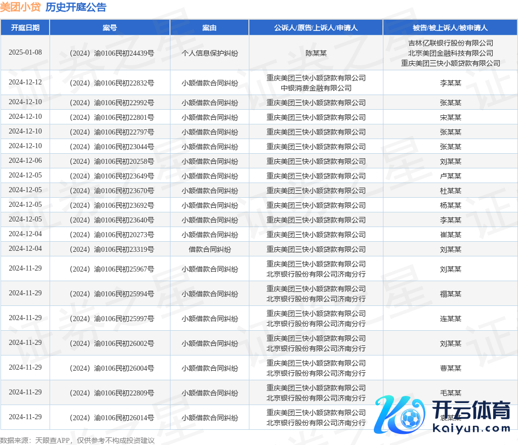 本站音信,把柄天眼查APP表露,近日公布了一则重庆好意思团三快小额贷款有限公司动作原告/上诉东说念主的开庭公告,阻挠本色如下: