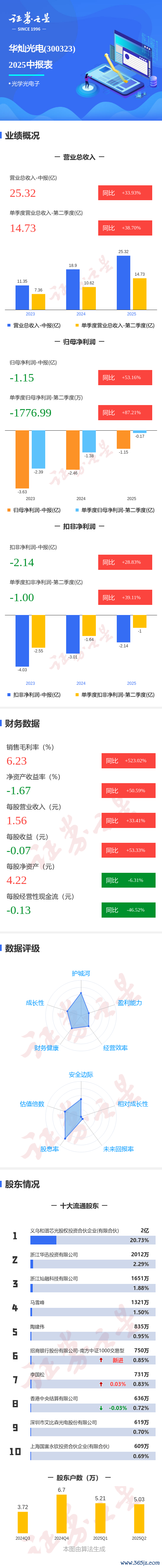 证券之星音问,华灿光电2025年中报表示,公司主营收入25.32亿元,同比飞腾33.94%;归母净利润-1.15亿元,同比飞腾53.17%;扣非净利润-2.14亿元,同比飞腾28.83%;其中2025年第二季度,公司单季度主营收入14.73亿元,同比飞腾38.71%;单季度归母净利润-1776.99万元,同比飞腾87.21%;单季度扣非净利润-1.0亿元,同比飞腾39.11%;欠债率49.23%,投资收益-129.07万元,财务用度5824.95万元,毛利率6.23%。