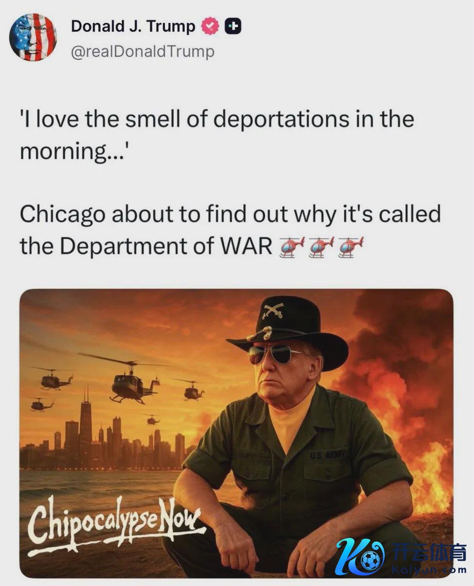 9月6日早些时候,特朗普在其“竟然外交”平台上发布了一张疑似由东谈主工智能生成的图片,并配文说:“芝加哥将会知谈(国防部)为什么要被叫作干戈部。”