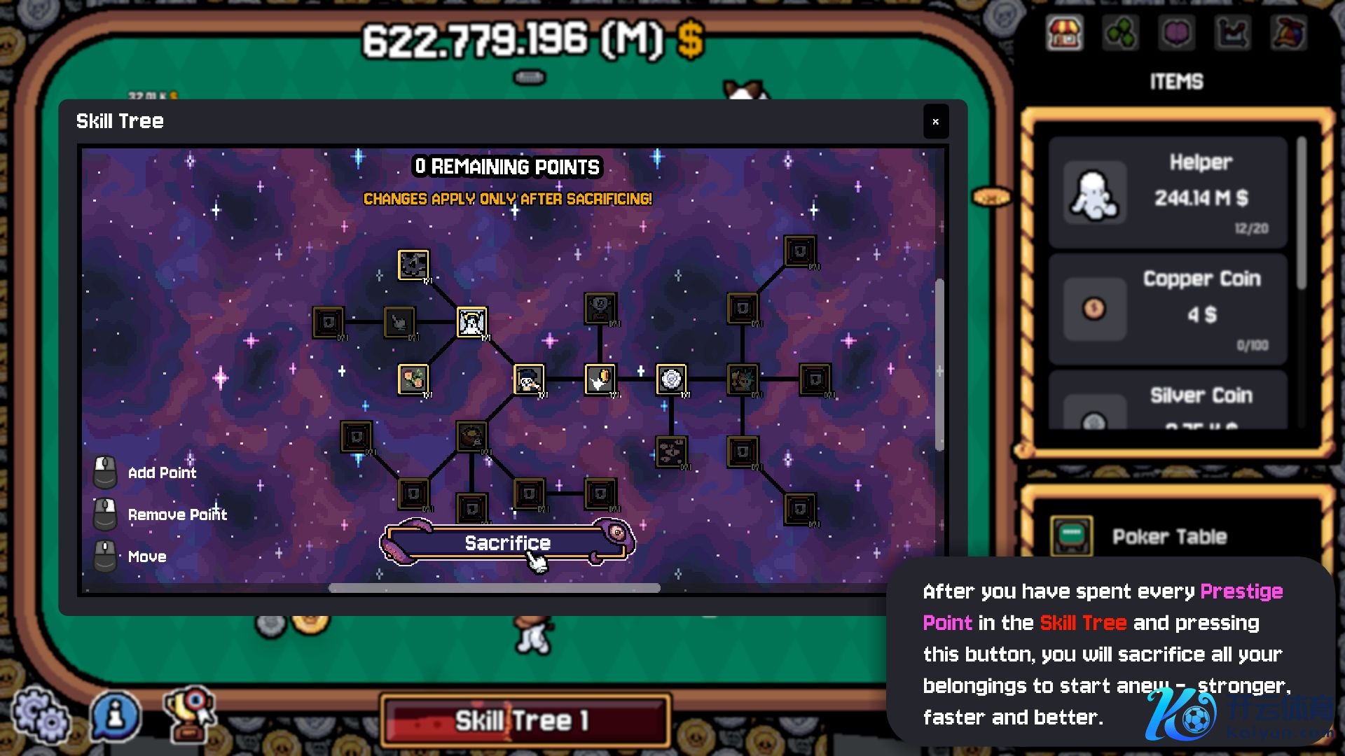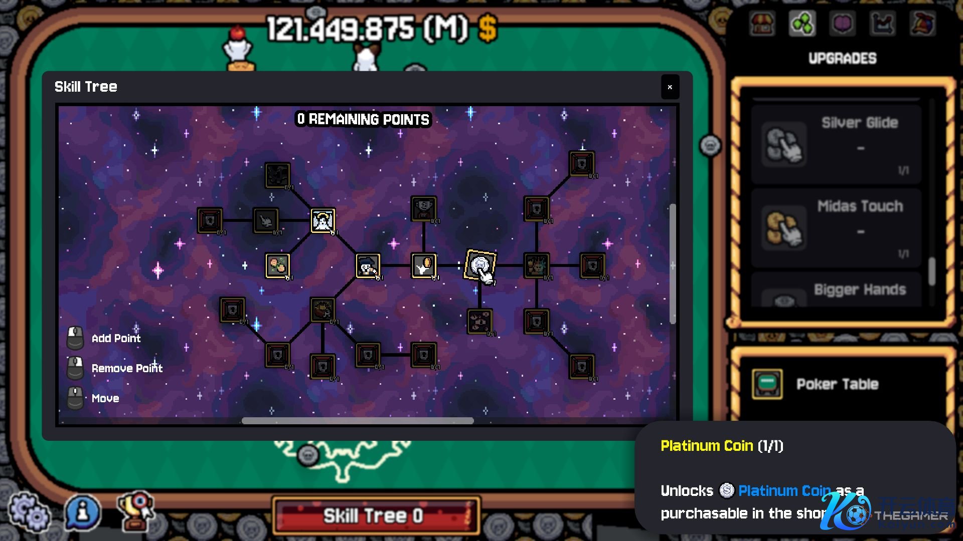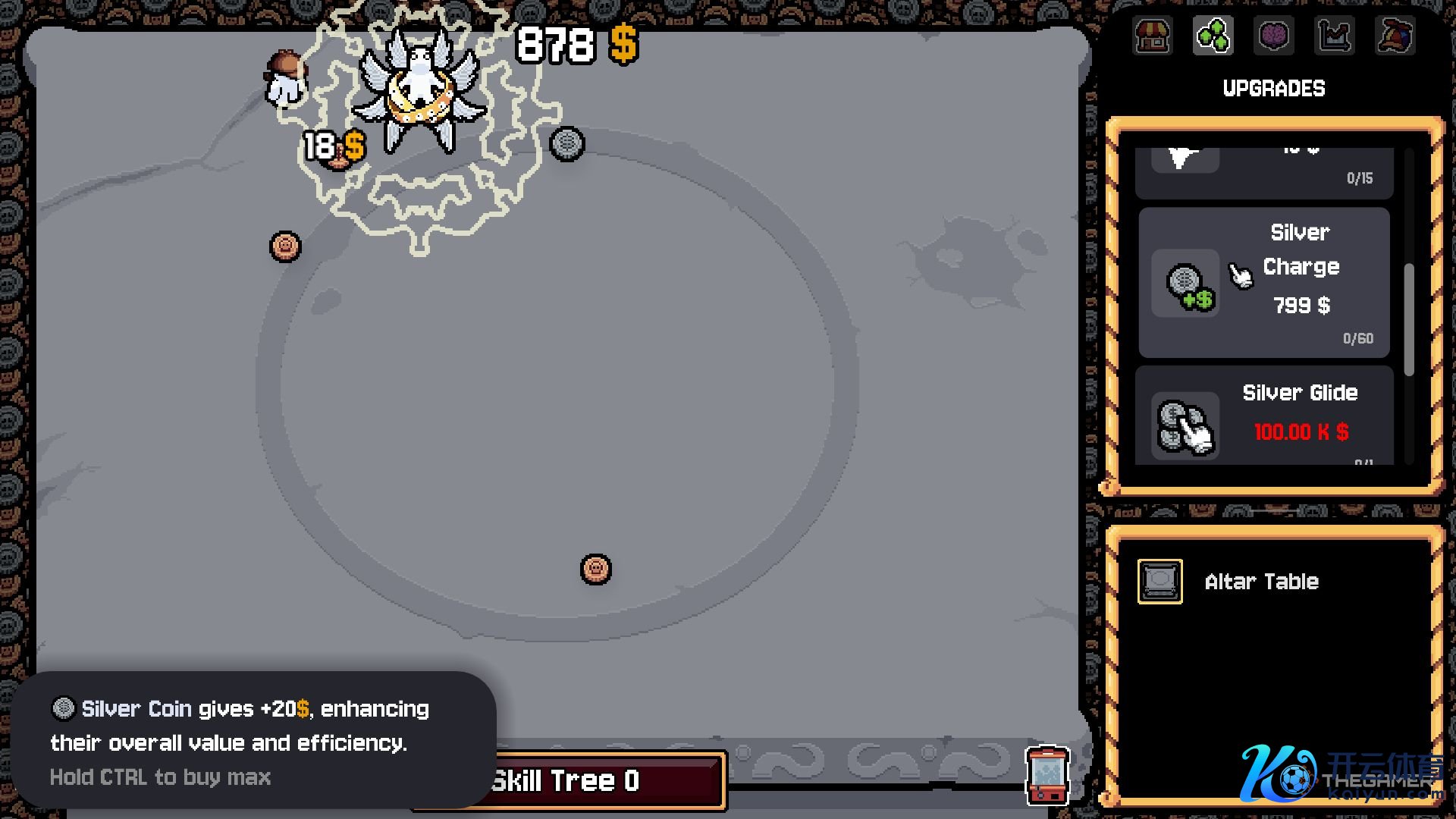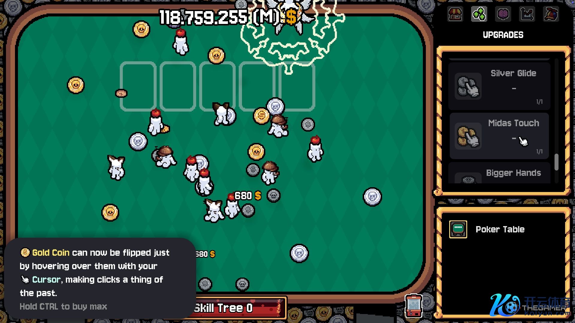 这是因为你只需在桌面上滑动光标,就能快速翻转悬停过的每一枚硬币。由于你的棋盘很可能大部分填满了银币和金币,“白银滑行”(允许不点击翻转银币)和“点金之手”(允许不点击翻转金币)升级将让你受益最大。
