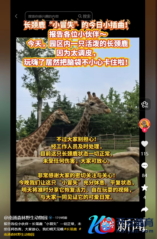 随后,记者发当今抖音平台上一个认证为南通丛林野无邪物园的账号发布了一则视频称,长颈鹿“小卤莽”的小插曲!因为太即兴,玩嗨了,的确把脑袋不贯注卡住啦!画面下方的翰墨称,经职责主说念主员实时管理,咫尺这只长颈鹿情状一切浮浅,未受任何伤害,全球可释怀。